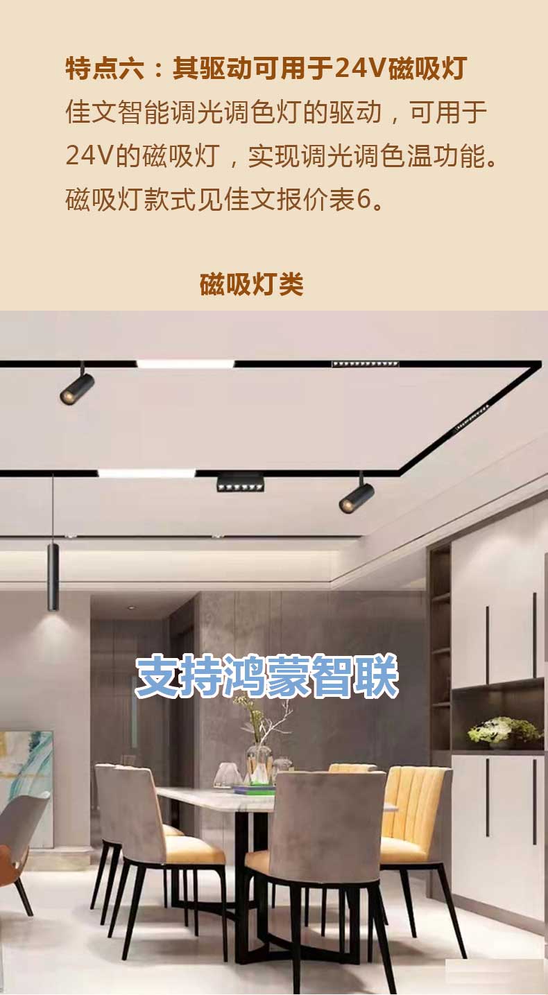 接入鸿蒙智联的佳文智能调光调色灯的6个特点。特点1:稳定,有433遥控器。特点2:恒压24V射灯集控。特点3:佳文恒压24V灯具全部可以接入。特点4:佳文恒压24V灯带可以接入。特点5:佳文恒压24V主灯可以接入。特点6:佳文恒压24V磁吸灯可以接入。